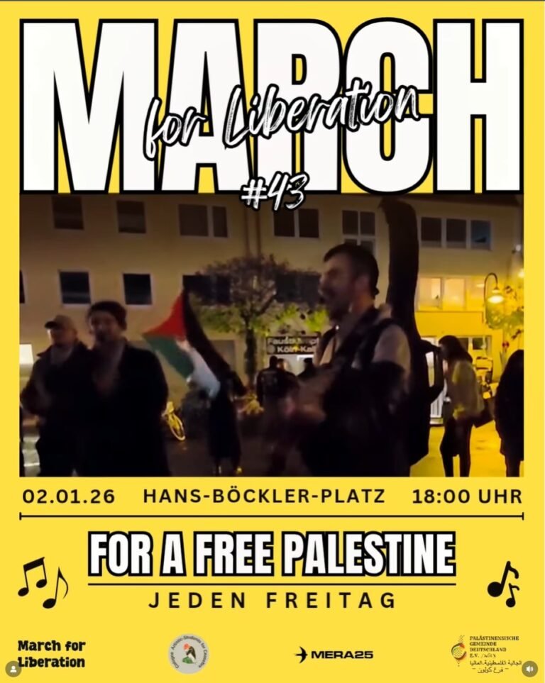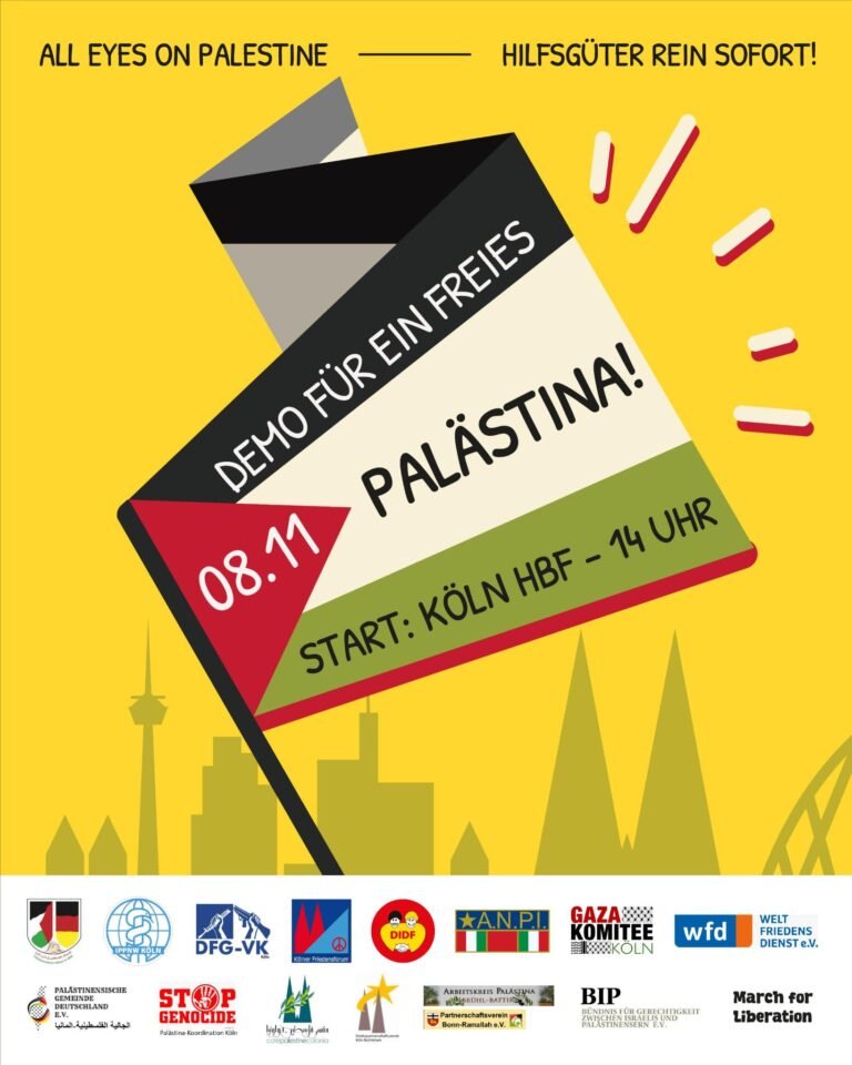 All-Eyes-on-Palestine Großdemonstration Köln 📅 Sa. 08.11.2025 🕑 14:00 Uhr 📍 Bahnhofsvorplatz (Hbf) Unter dem Motto „all-eyes-on-Gaza“ gingen am 27. September in Berlin über 100.000 Menschen auf die Straße. Daran knüpfen wir an: Denn Trumps „Friedensplan“ hat zwar zu einem Waffenstillstand…